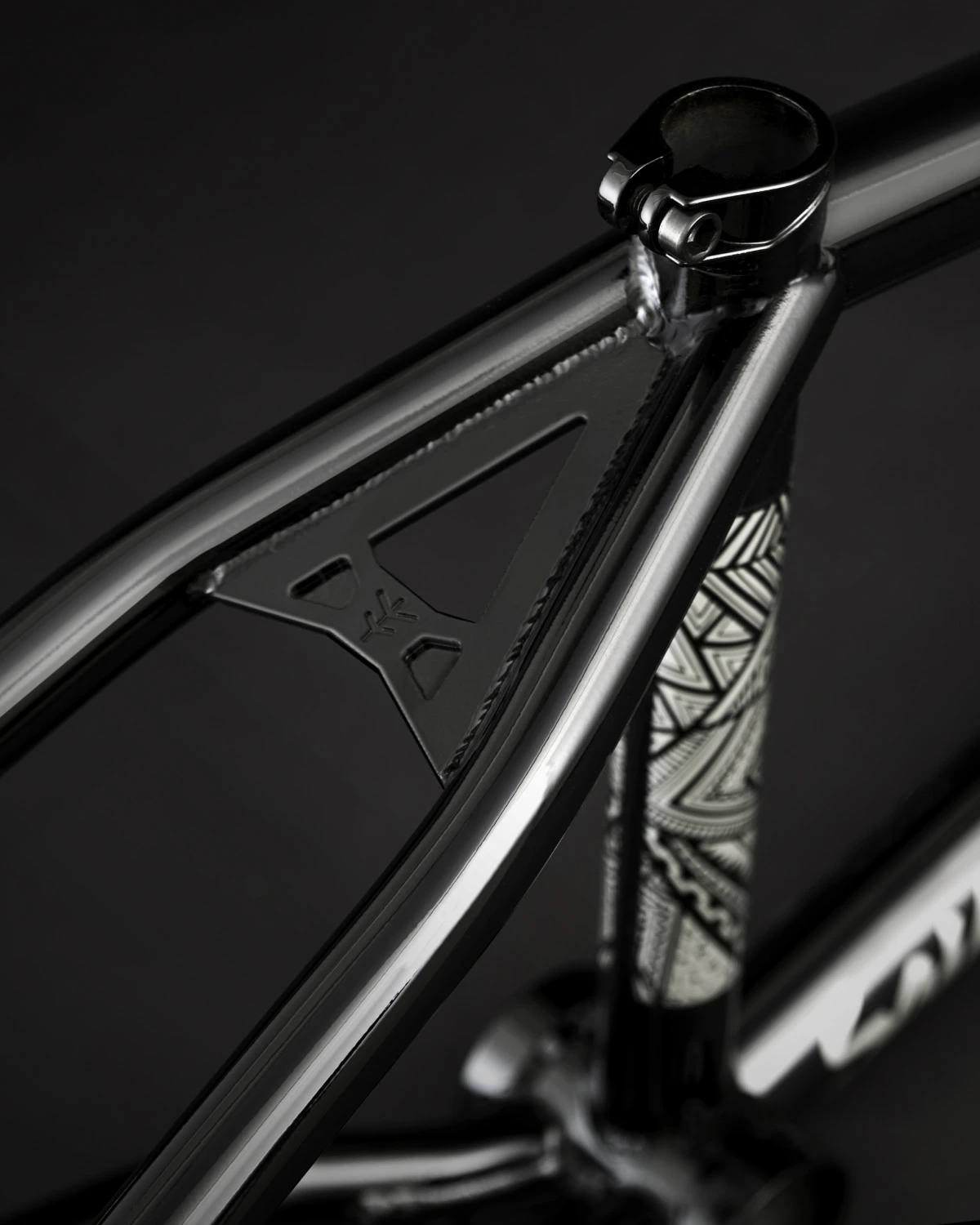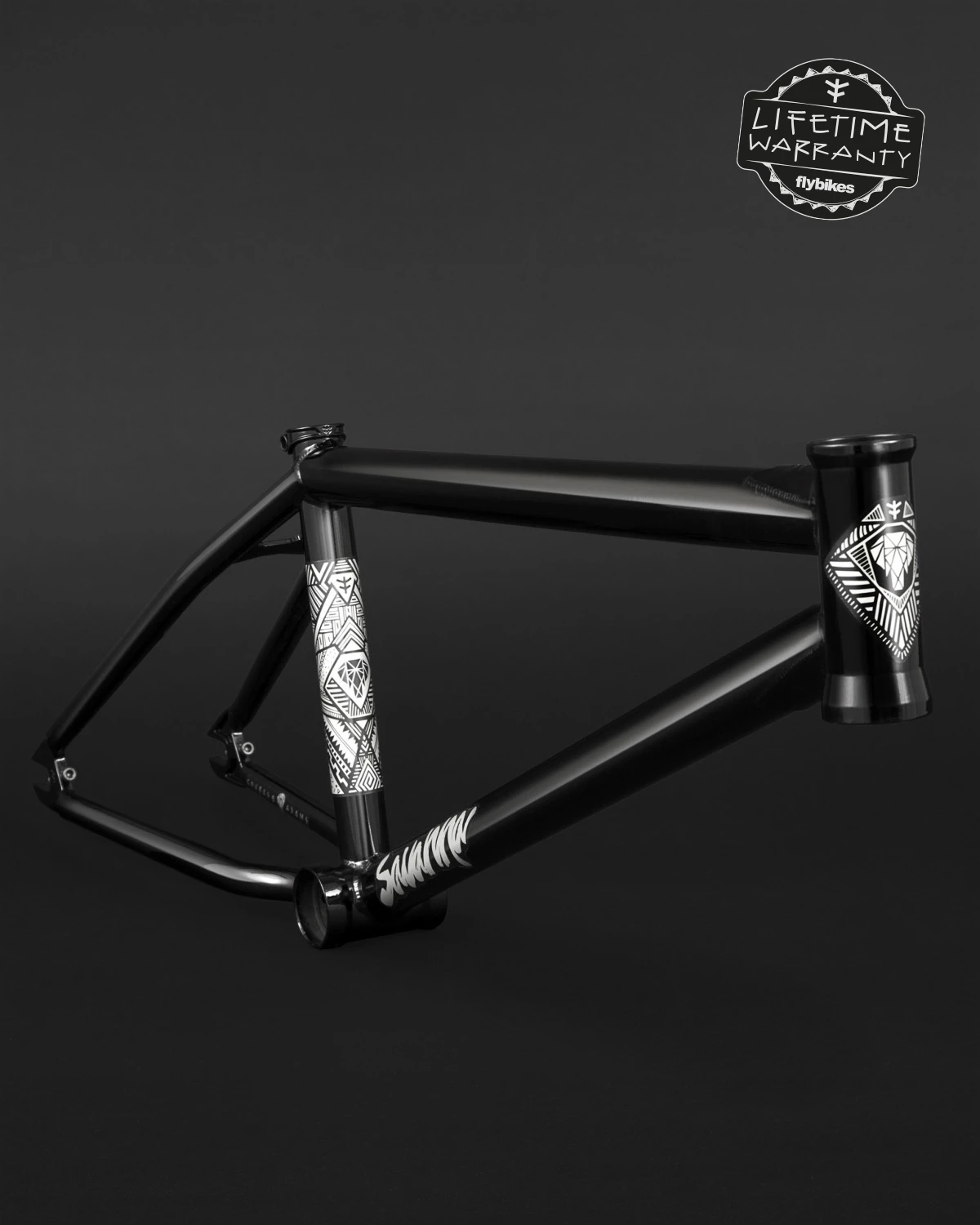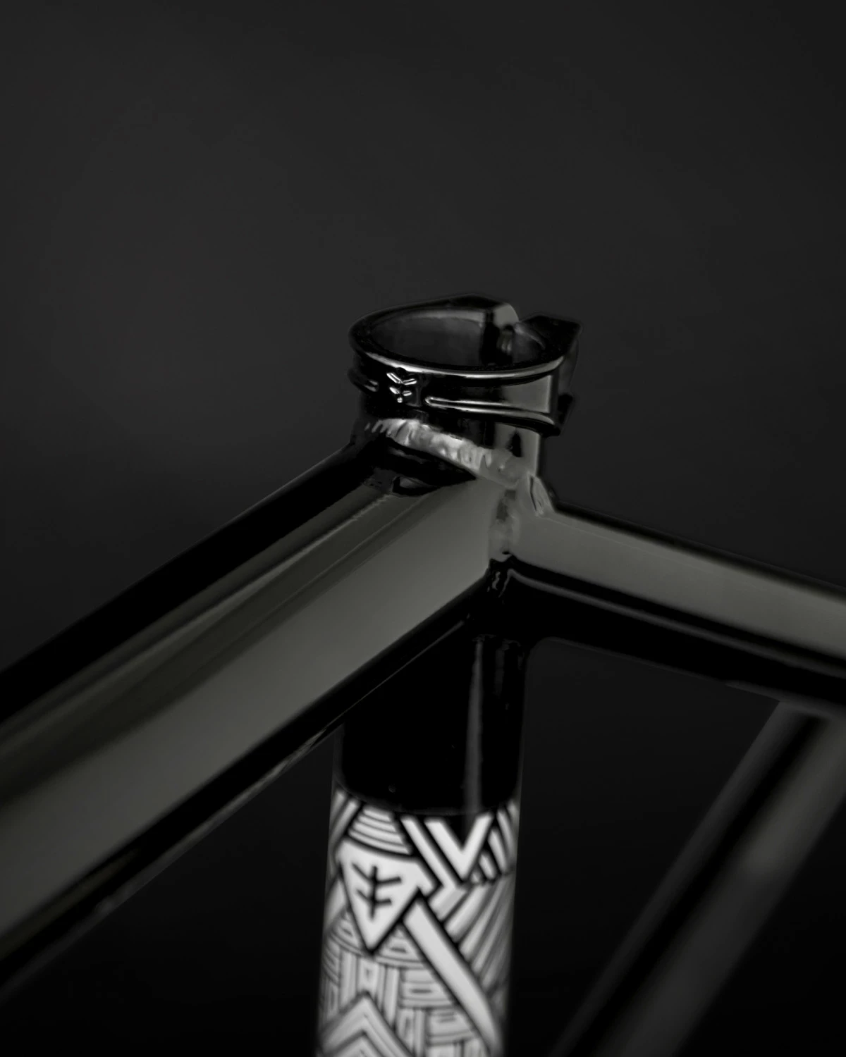 Le cadre comprend des goussets internes et externes, des tubes coniques et Ă Ă©paisseurs multiples, un collier de tige de selle Investment Cast avec le systĂšme de coupe horizontale et des pattes Investment Cast avec tendeurs de chaĂźne intĂ©grĂ©s. Il est sans frein, il n’y a donc ni supports ni guides.