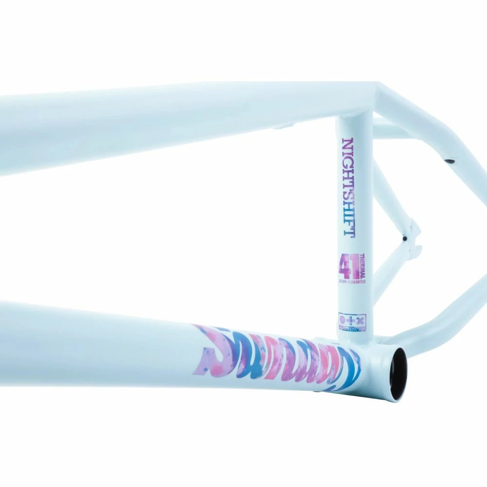 Le modèle Nightshift est un modèle 100% Chromoly 4130 avec un traitement 41 Thermal, ce traitement est propore Ă la marque et fait l’objet d’une grande technologie pour la resistance des tubes contre les chocs, les torsions. Sunday et Odyssey sont les seuls Ă dĂ©tenir ce brevet et proposent le « lifetime warranty » qui signifie une garantie Ă vie contre toute Ă©ventuelle casse ou torsion des pièces ayant ce traitement thermique.