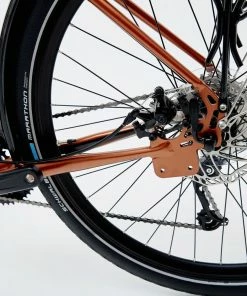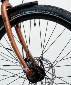 Les pneus larges Schwalbe Marathon sont rĂ©sistants Ă l’usure et aux crevaisons et disposent d’un flanc rĂ©flĂ©chissant pour une meilleure visibilitĂ©.